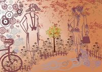 digital erstelltes bild mit frauen,blumen,fahrrad, sonntagsspaziergang.
