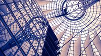 Het kunstwerk "Sony Center am Potsdamer Platz" toont de indrukwekkende dakstructuur van het gelijknamige gebouwencomplex in Berlijn. Centraal staat het radiale patroon van de dakconstructie met een opvallende opening in het midden. De filigrane stalen liggers en het doorschijnende materiaal laten daglicht door en creëren een samenspel van licht en lijnen. De reflectie van de structuur op de glazen gevel van een naburig gebouw is bijzonder fascinerend - het motief wordt verdubbeld en de symmetrie wordt versterkt.