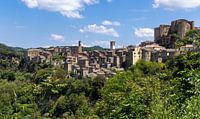 Sorano is een tufstenen stadje in het zuiden van de Italiaanse provincie Toscane. Het ligt mooi op de top van een heuvel en kijkt uit over een groen en bosrijk landschap. Hier zien we de stad in badend in het zonlicht.