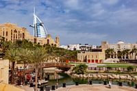 Souk Madinat Jumeirah in Dubai, met op de achtergrond Burj al Arab, het enige 7-sterrenhotel ter wereld.