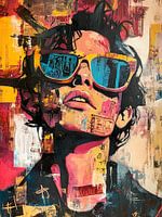 Soul Reflections - Dit portret schilderij toont een jonge man met zonnebril omgeven door dynamische, abstracte penseelstreken en levendige kleuren die de innerlijke chaos en stijl uitdrukken.