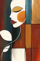 Figuratieve abstractie in aardetinten met het profiel portret van een vrouw,bloemblaadjes en lijntekening en kubistische elementen.