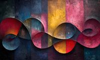 Kleurrijk abstract schilderij met golven, kubistische elementen en een grove steen structuur.