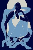 Grafische tekening en fotobewerking, donker model en tekening naar een voorbeeld van Matisse in blauwe kleuren.
