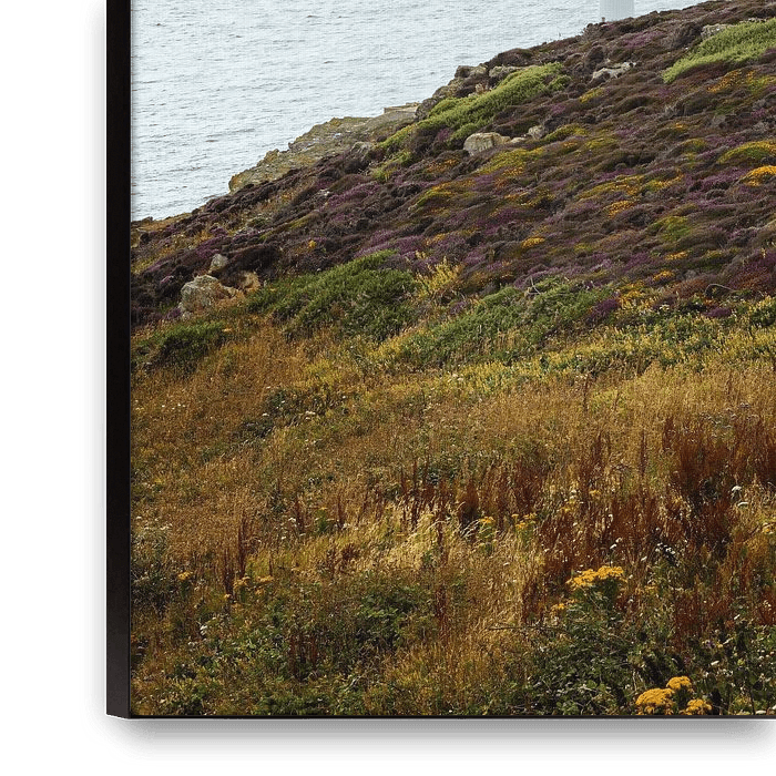 De vuurtoren steekt zijn kop net boven de kliffen van South Stack uit. De rotsen zijn met bloeiende heide bedekt. In het Welsch heet deze toren Goleudy Ynys Lawd.