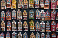 Verzameling van Nederlands gethematiseerde souvenir huisjes met Engels opschrift. Fietsen, tulpen, kaas, klompen. Toerisme in Nederland. Deze foto is gemaakt in Delft, in de Zomer van 2021