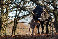 Kalfje op de Oude Reemst bij de Planken Wambuis op de Veluwe. Het Sayaguesa ofwel Spaanse rund stond met haar kalfje ongeveer 10 meter bij me vandaan. Die afstand heb ik ook maar bewaard, om hen niet te storen. Beiden houden me in de gaten en vragen zich misschien af wat dat mens op haar knieën aan het doen was. Ik wandelde na het maken van de foto heel even verder om na een paar minuten terug te keren op deze plek. Beiden waren in geen velden of wegen meer te bekennen!