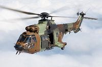 Een AS532UL Cougar helikopter van de Spaanse Landmacht vliegend over de Sistema Ibérico bergen.