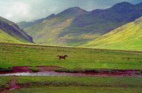 Berglandschap met rennend wild paard