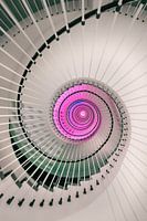 Deze foto is gemaakt in het ziekenhuis van Barakaldo, een voorstadje van Bilbao in Spanje. Deze spiraaltrap is een echt kunstwerk die tot wel 9 etages hoog reikt. ' s Avonds wordt de trap met blauw licht verlicht.