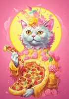 Een geïllustreerde kat die aan het genieten is van een stuk pizza. Het wordt extra vrolijk met rozen, een zon en wolken.