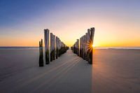 Een golfbreker aan het strand bij Westenschouwen, waar de dag het strand nog onaangeroerd heeft gelaten.
