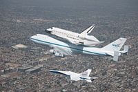 de spaceshuttle op een boeing begeleid door een straaljager over kale Kennedy.