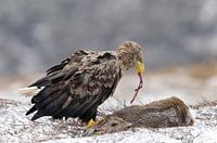 Een volwassen zeearend met een vrouwtje ree als prooi. De foto is gemaakt in de heuvels van de provincie Nord Trondelag in Noorwegen.