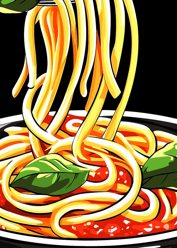 Het motief toont een gestileerde afbeelding van een portie spaghetti in een zwarte kom, geserveerd met een felrode tomatensaus. Een vork tilt wat noedels uit de kom, versierd met verse basilicumblaadjes. De krachtige kleuren en duidelijke lijnen geven de afbeelding een modern en smakelijk karakter. De zwarte achtergrond benadrukt de spaghetti en de saus in hoog contrast, waardoor het gerecht het middelpunt van de belangstelling wordt.