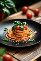 Een kunstig gerangschikt bord pasta, omringd door felrode kerstomaatjes en verse basilicum, verspreidt een heerlijk aroma. De harmonieuze schikking van de spaghetti nodigt uit tot smullen en roept eetlustopwekkende herinneringen op. Deze foto zou een perfecte aanvulling zijn op de keuken om een passie voor lekker eten te vieren.