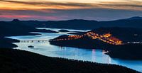 Spanje Andalusië met uitzicht op Iznajar en het meer van Iznajar bij zonsondergang. Een prachtig uitzicht in de heuvels van Andalusië. Het dorp behoort tot de mooiste van Spanje en ligt idyllisch op de top van een heuvel.