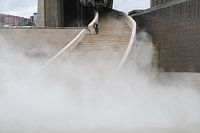 Om de zoveel tijd werd er nevel de lucht in gespoten bij het water rondom het museum. Daardoor lijkt de trap te verdwijnen in de nevel,…