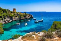 Spanje Mallorca eiland, mooi uitzicht op baai met boten en Torre de Cala Pi, Balearen, Middellandse Zee