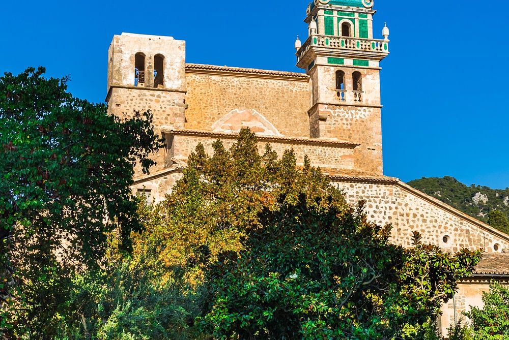 Spanje Mallorca, mening van klooster met mooi park in Valldemossa, Mallorca, Balearen, Balearenzee, Middellandse Zee, Spanje
