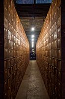 een spannend doorkijkje tussen rijen van gestapelde archiefkisten in een verlaten fabriek. De lichtval van het rijtje lampen (kale peertjes) aan het plafond weerkaatst op de wand van kisten en versterkt het perspectief.