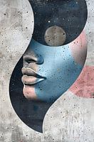 Figuratieve abstractie met het profiel portret van een vrouw in voornamelijk beige,blauw en roze tinten op een grove steen structuur.