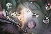 Fantasie abstract in paars, groen en grijze tinten met druppels en kristal structuur.