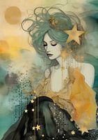 Prachtige afbeelding van een vrouw in serene overpeinzingen. Goudgeel met aquablauw en zwart, wit en grijstinten. Gouden sterren complementeren het geheel. De vrouw kijkt naar beneden. Zij draagt een mooie zwarte zijden jurk en een blouse met geel en goud accenten. Abstracte schakeringen in de achtergrond. Passend bij diverse stijlen en trends. Artist: Bianca ter Riet.