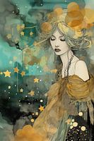Prachtige afbeelding van een vrouw in serene overpeinzingen. Goudgeel met aquablauw en zwart, wit en grijstinten. Gouden sterren complementeren het geheel. De vrouw kijkt naar beneden. Zij draagt een mooie gouden zijden jurk. Abstracte schakeringen in de achtergrond. Passend bij diverse stijlen en trends.