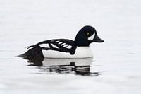 Barrow's Goldeneye / Spatelente ( Bucephala islandica ) in winter, swimming, wildlife, Greater Yellowstone Area, USA.