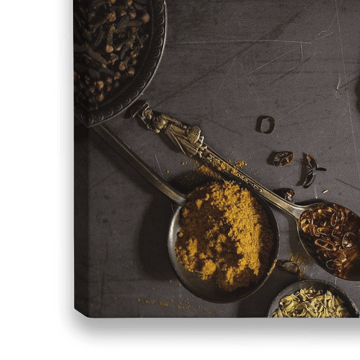 Koop dit stilleven Specerijen op een oude bakplaat van Saskia Schepers op canvas, aluminium dibond, (ingelijste) fotoprint, behang en ArtFrame, op maat geprint in Fine-Art kwaliteit.