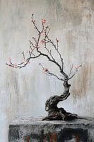 Een bijzondere, oude bonsai van verweerd hout staat op een ruwe, betonnen tafel. De takken kronkelen gracieus, als een dans van de natuur zelf. Tussen het verweerde hout bloeien zachte, roze amandelbloesems. Er zijn maar een paar bloemen te zien, maar ze lijken zorgvuldig gekozen, alsof de boom elk bloemblaadje koestert. Op de achtergrond trekt de subtiele textuur van de beige betonnen muur de aandacht, waardoor de kleuren van de bloesem nog zachter en rustgevender overkomen. Het contrast tussen de ruige structuur van de bonsai en de betonnen tafel creëert een eenvoudig, maar krachtig beeld dat stilte en kalmte uitstraalt, perfect om in weg te dromen.