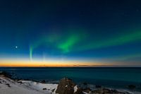 Spectaculair dansend groen sterk noorderlicht boven het beroemde ronde keienstrand bij Uttakleiv op de Lofoten-eilanden in Noorwegen op heldere winternacht met besneeuwde bergen