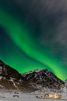 Spectaculair dansend groen sterk noorderlicht boven het beroemde ronde zandstrand bij Haukland op de Lofoten eilanden in Noorwegen op heldere winternacht met besneeuwde bergen