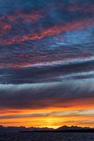 De lucht bestond uit meerdere lagen verschillende soorten wolken. De ondergaande zon bescheen deze wolken van onderaf waardoor delen oranje en rood werden. Grote delen bleven echter ook lichtblauw. De lucht veranderde met de minuut, overal waar je keek was de omgeving adembenemend mooi. Bergen en gletsjers vormden het decor van deze prachtige zonsondergang.