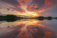 Zweden is het land van de vele meren en bomen. Vaak valt de wind in de avond weg en werkt het water als een spiegel. Als er dan ook nog eens een spectaculaire rode zonsondergang is met enkele wolken in de lucht, dan is het genieten in optima forma.
