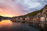 Een spectaculaire zonsopkomst in het Belgische dorpje Dinant. De gekleurde huizen aan de oever van de rivier en maken het beeld compleet.