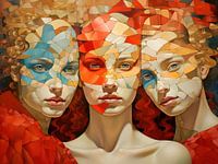 Hier zien we een drietal figuren, hun kenmerken een boeiende collage van geometrische vormen. Het kunstwerk is een visuele verkenning van identiteit en emotie, elk kleursegment vertegenwoordigt een fragment van persoonlijkheid. De interactie van warme en koele tinten weeft een verhaal van onderlinge verbondenheid en suggereert de veelzijdige aard van menselijke expressie.