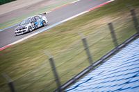 Met hoge snelheid rijdt deze Mitsubishi Evo langs onbezette tribunes in Assen.