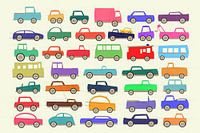 Kunst voor de kinderkamer. Houten speelgoed. Auto´s in de file in schetsstijl. Een tractor, vrachtauto, cabriolet, brandweerwagen, bus, Volkswagen. Tesla, sleepwagen, pickup truck, slee, sportwagen, Kinderen kunnen er zo mee spelen.