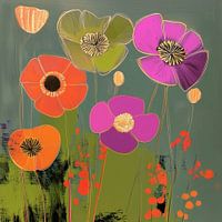 Speels en kleurrijk bloemenveld, met bloemen in levendige tinten van oranje, rood, roze, paars en groen tegen een olijfgroene achtergrond. De bloemen zijn gestileerd en hebben een grafische kwaliteit, met duidelijke lijnen en contouren die de vormen accentueren. De stelen en bladeren zijn dun en sierlijk, en kleine rode accenten…