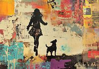 Speels Silhouet met Kleurrijke Achtergrond - Dit is een levendig urban kunstwerk geïnspireerd door Banksy, met een silhouet van een meisje dat hand in hand lijkt te springen met haar hond, tegen een achtergrond vol abstracte, kleurrijke vormen en collage-elementen.