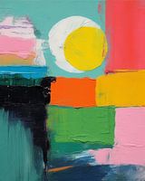 Modern abstract in neon en pastelkleuren (gezien bij vtwonen)Studio Allee Abstract schilderij in warme kleuren (gezien bij vtwonen)Studio Allee