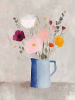 Een speels en kleurrijk stilleven dat licht en vrolijkheid in huis brengt. De losse verfstreken en zachte pasteltinten geven dit werk een frisse en eigentijdse uitstraling. De bloemen lijken net geplukt uit een zomertuin en zijn nonchalant geschikt in een eenvoudige kan of vaas, waardoor het kunstwerk een warme, huiselijke sfeer krijgt. Perfect voor wie houdt van zachte kleuren, een tikkeltje poëzie en een interieur dat mag ademen en leven.