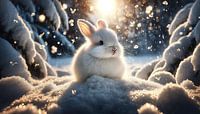 Een schattig wit konijntje zit knus op een hoop sneeuw, omringd door zachtjes vallende sneeuwvlokken die het licht van de winterzon vangen. Het tafereel ademt een magische sfeer, benadrukt door het spel van licht en schaduw. De sneeuw lijkt tot leven te komen onder de zachte aanraking van de sneeuwvlokken en de haas, met zijn zachte vacht en waakzame ogen, lijkt een vredige bewoner van dit stille rijk. De omringende besneeuwde takken vormen een zacht contrast met de stralende lucht en maken deze schilderachtige winteridylle compleet.