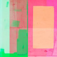 Speels vierkant modern abstract in licht oranje, roze en groen. Verschillende transparante lagen over elkaar geven dit werk diepte. Volgens de trendkleuren van 2023. Een "bold statement" in je interieur!