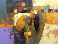 Details: abstract schilderij, geometrisch, gouden vormen, bruin, blauw, paars, rood, kunst, moderne kunst, dynamisch
