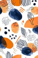 Dit levendige trendy kunstwerk combineert organische vormen en geometrische patronen in een fris palet van oranje, blauw en wit.