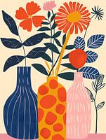De zorgvuldig gekozen kleuren en levendige composities vangen de tijdloze schoonheid van een klassieke bloemenvaas uit vervlogen tijden. De retro flair wordt versterkt door speelse accenten, waardoor een unieke en uitnodigende sfeer ontstaat die zowel charmant als verfijnd is.