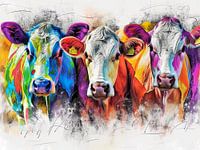 Dit levendige schilderij vangt de vrolijkheid van het platteland met een speelse weergave van kleurrijke koeien. De levendige kleuren spatten van het canvas en creëren een opgewekte sfeer. De koeien, elk met hun eigen unieke kleurenpatroon, kijken nieuwsgierig en speels in de lens.